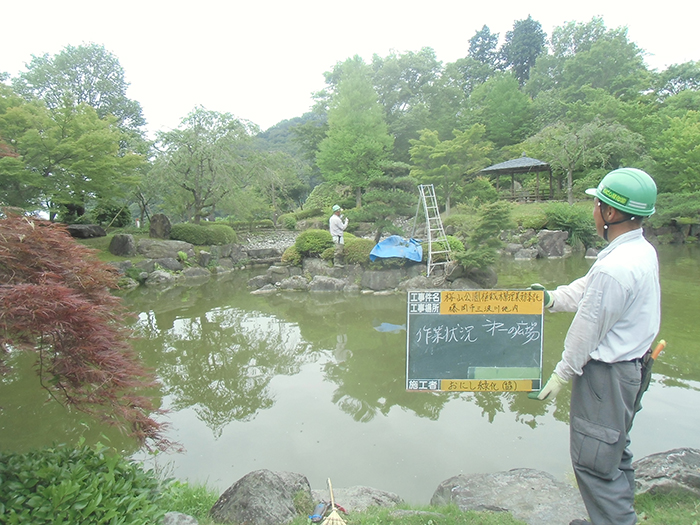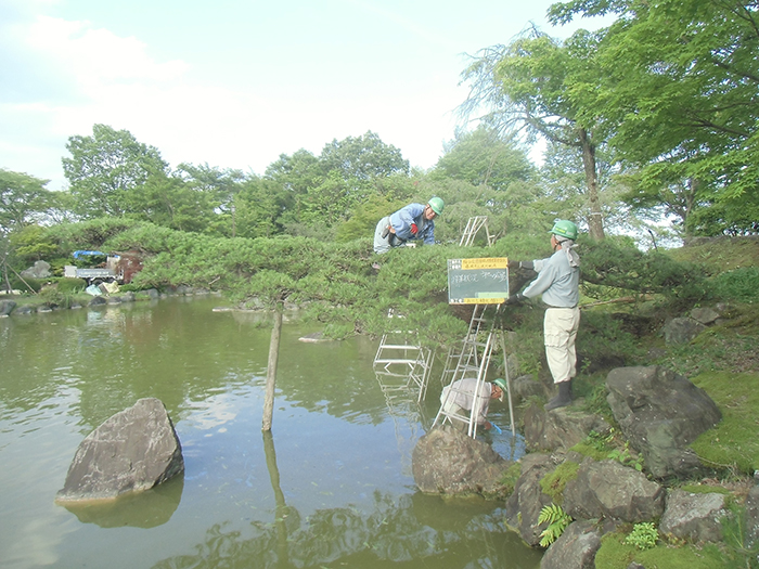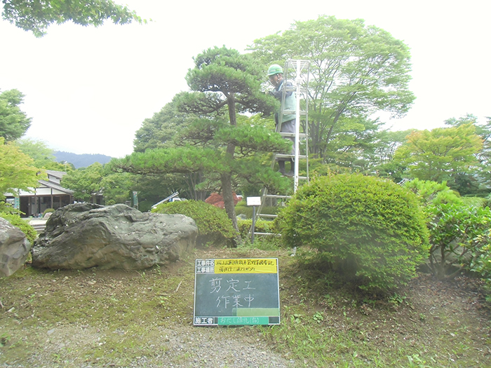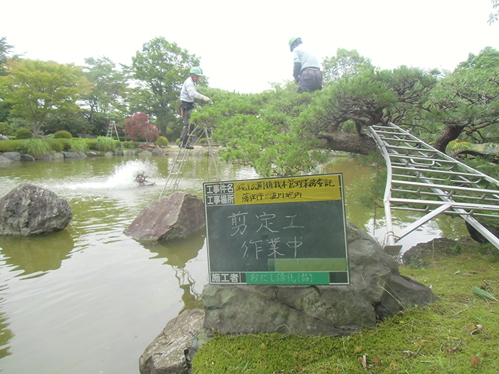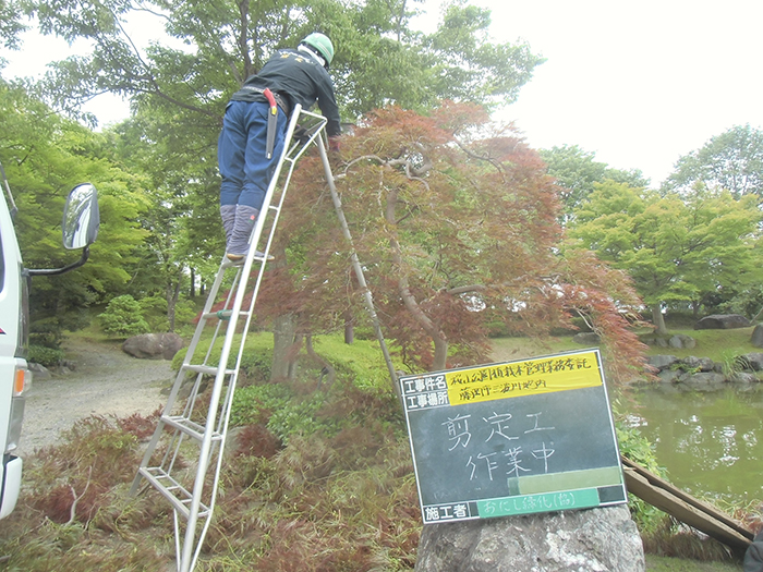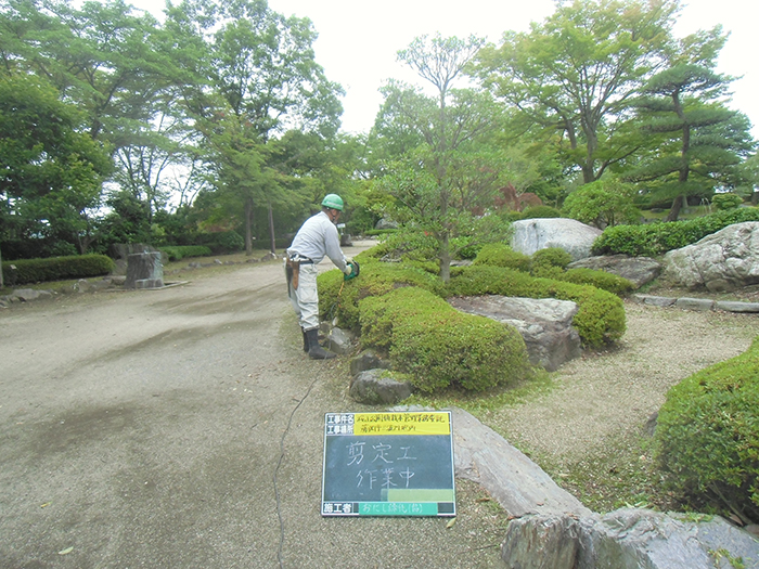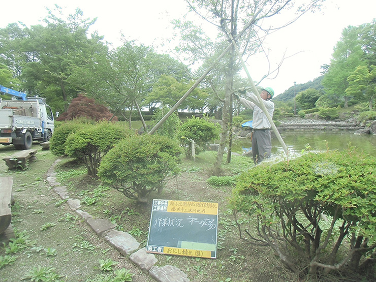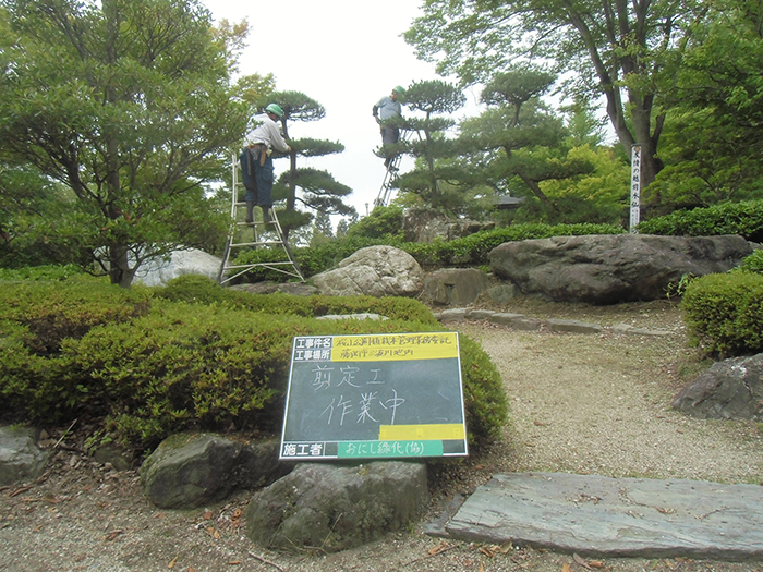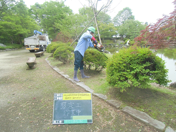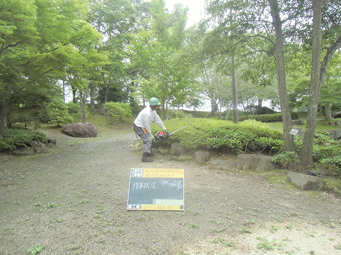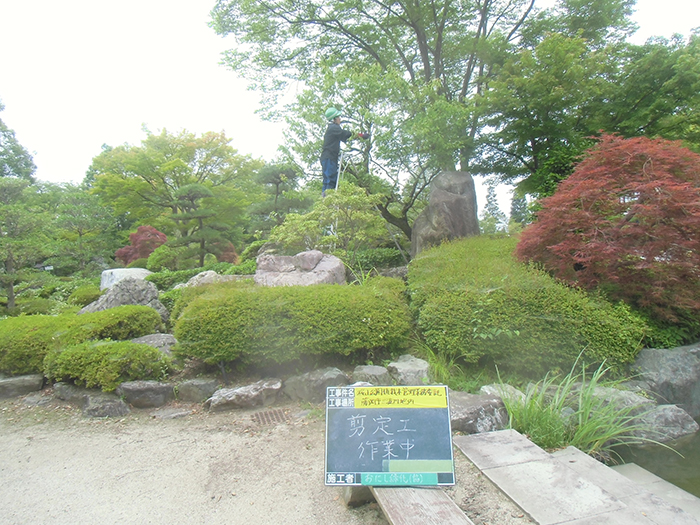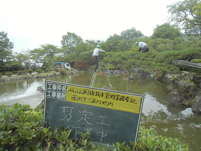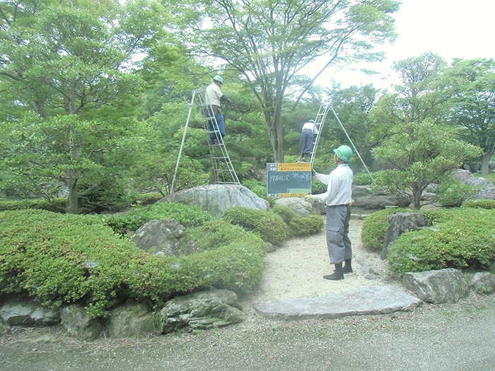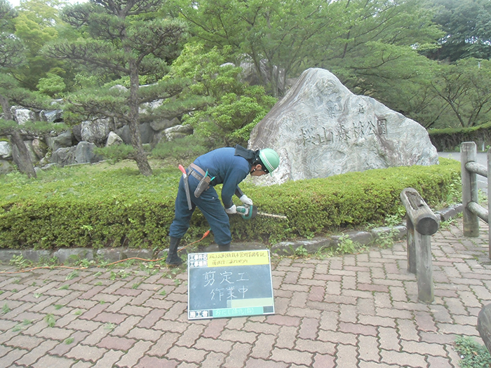 桜山公園内にある第一の広場(池のある日本庭園)第二の広場(茶室と三波石を使った見本庭園)第三の広場(イベントなどで使われる 芝生広場)の寄植・生垣・玉物の刈込や松・桜・楓・ツツジ等の植栽木の管理業務を行っております、その様子を写真でご紹介します。 スライドは日本庭園の四季 下の写真は業務している様子です。 資格を持った経験豊富な組合員が、樹木剪定・樹勢回復・危険木の伐採・高所枝打ち作業・刈払機作業等の維持管理業務を行います。