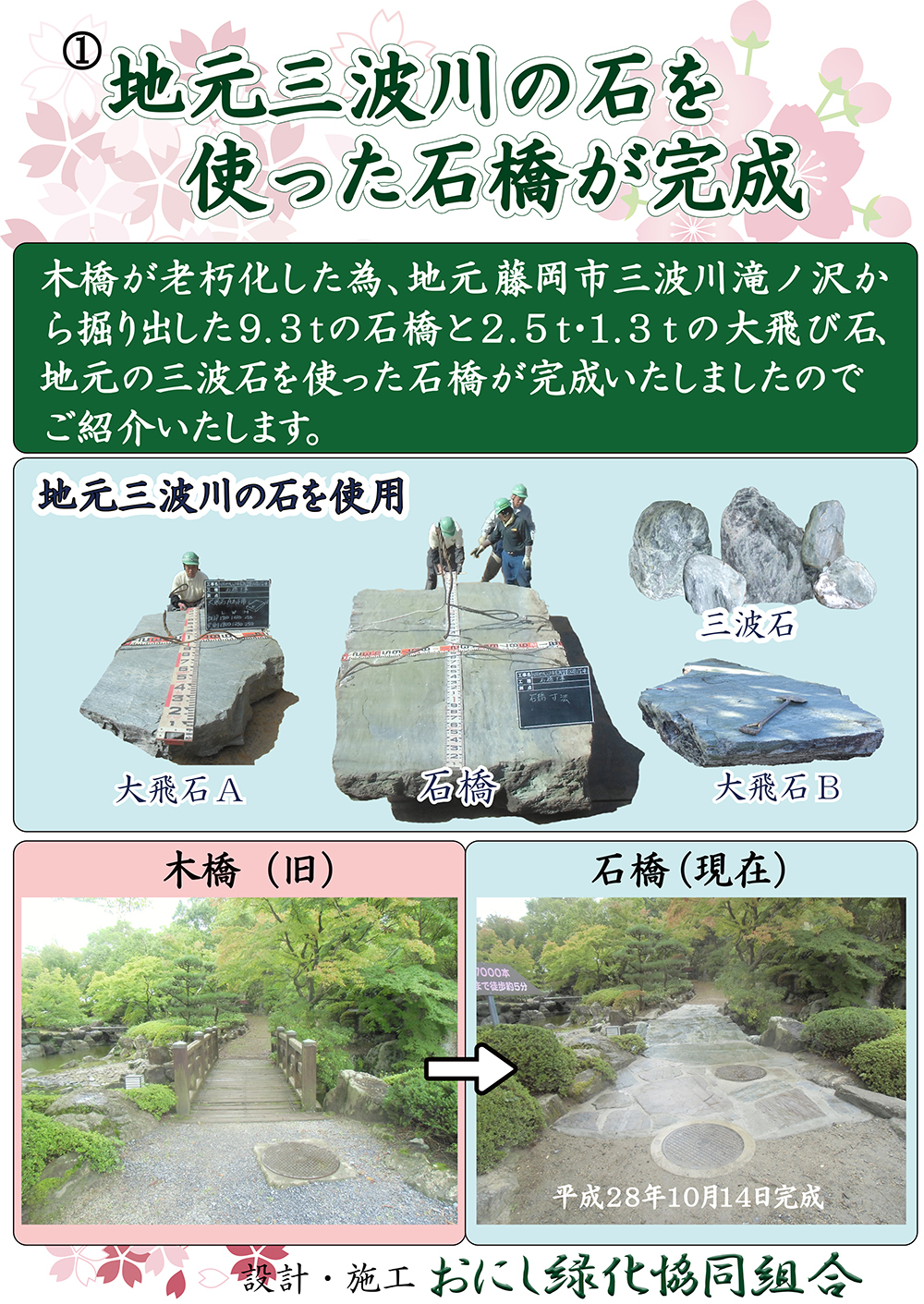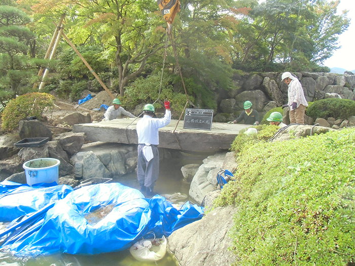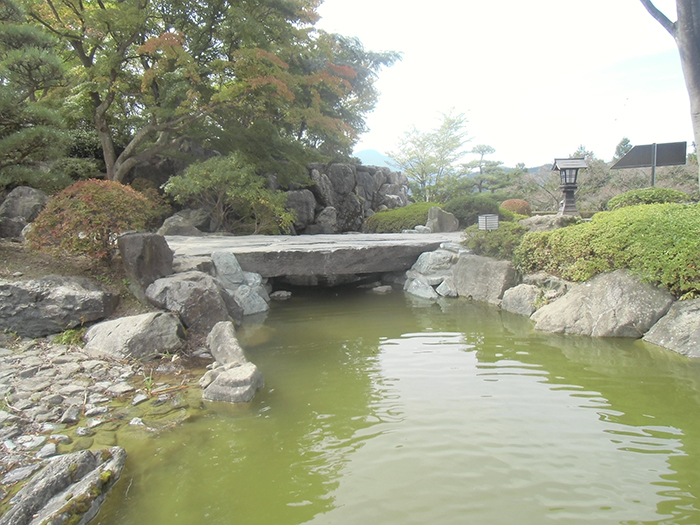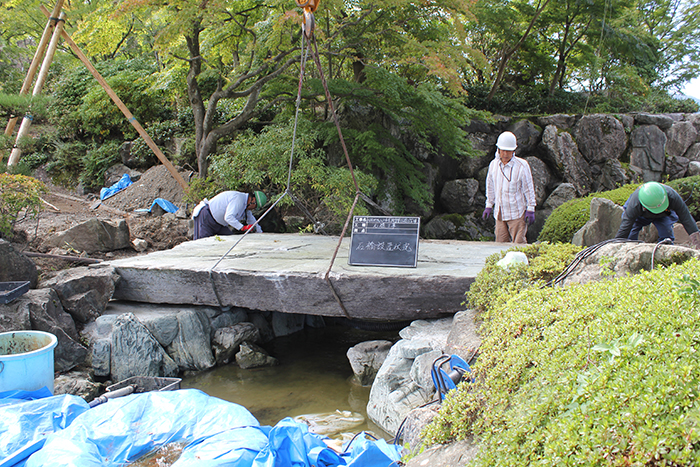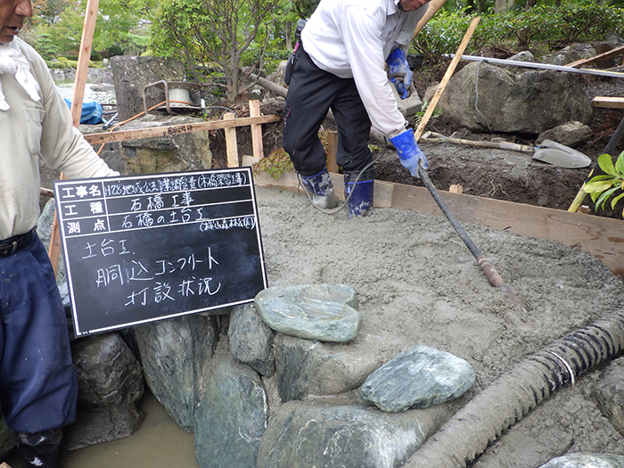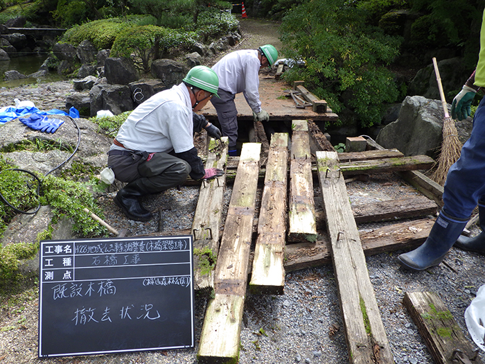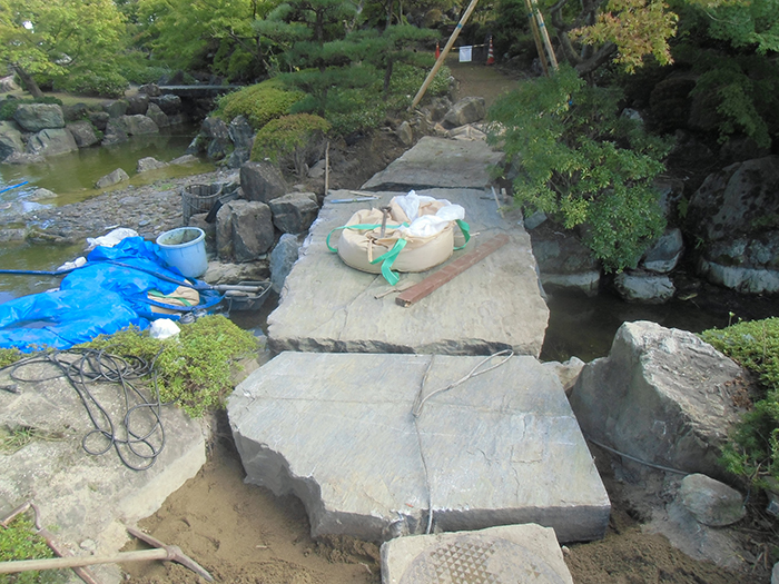 桜山公園内日本庭園の木橋が老朽化した為、地元三波石を使った石橋を設計施工した事例のご紹介です。