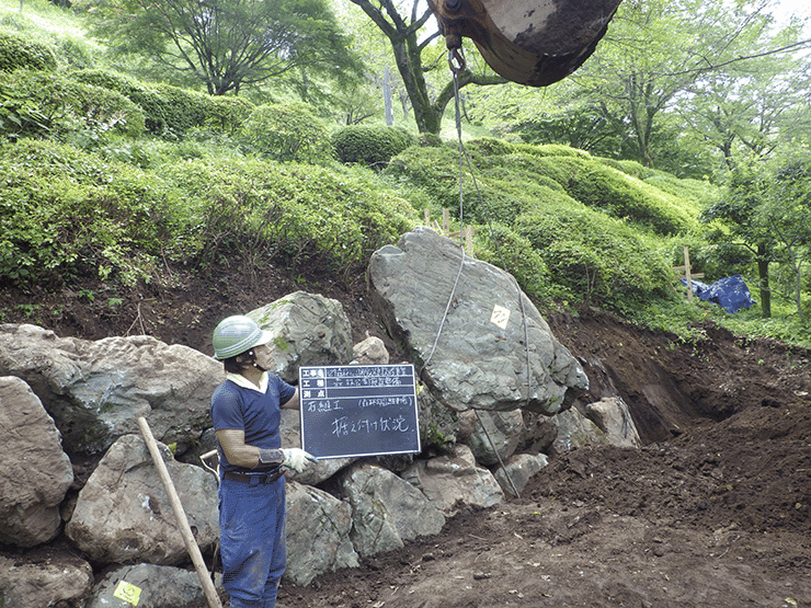 造園施工管理技士及び石材施工技能士が設計施工し駐車スペースに 有った庭石を石垣に有効活用しました。
