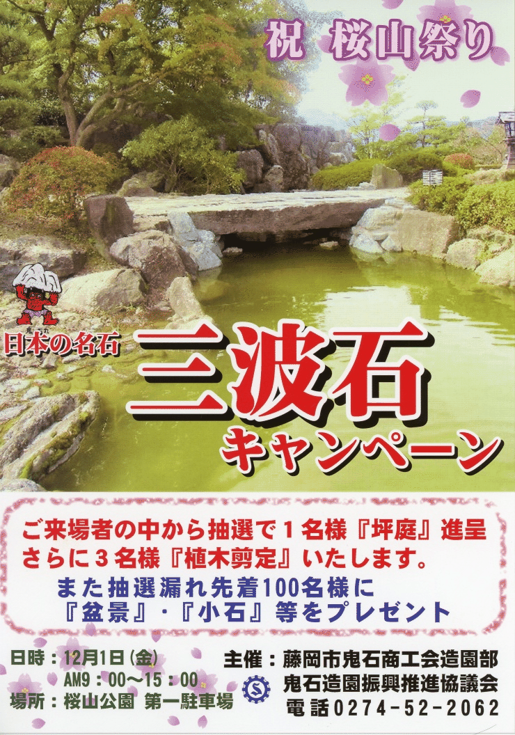 国指定名勝及び天然記念物「冬桜が」咲く藤岡市三波川の桜山公園で毎年12月1日に桜山祭りが行われます、今年も式典が盛大に行われました、式典後に藤岡市親善大使の歌手湯原昌幸さんのショーも行われました。おにし緑化協同組合では日本の名石 地元三波石キャンペーンに参加し抽選で1名様に坪庭、3名様に植木剪定を進呈、更に先着100名様に盆景・小石・等プレゼントを行いました。又、公園内の管理棟でおにし緑化協同組合で設計・施工した、地元三波石を使った石橋と第二の広場に駐車スペースを確保し茶室・見本庭園・トイレの利便性向上のプロセスを掲示、皆様に見て頂きました。